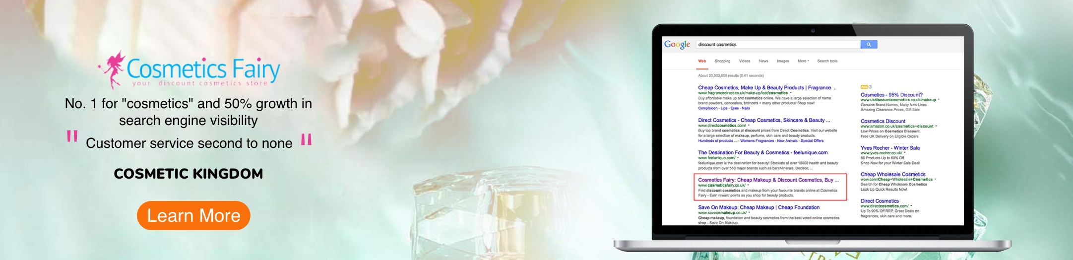 In the words of the client, our work “led to a continuous rise in visits to the website with a direct increase in sales”. Cosmetic Kingdom reported a considerable ROI within a short period of time. Our seo work helped their new Cosmetics Fairy website to rank on page 1 for competitive keywords like “cheap cosmetics”and “cheap makeup”. After a lot of hard work, we achieved the number 1 position for “cosmetics”.