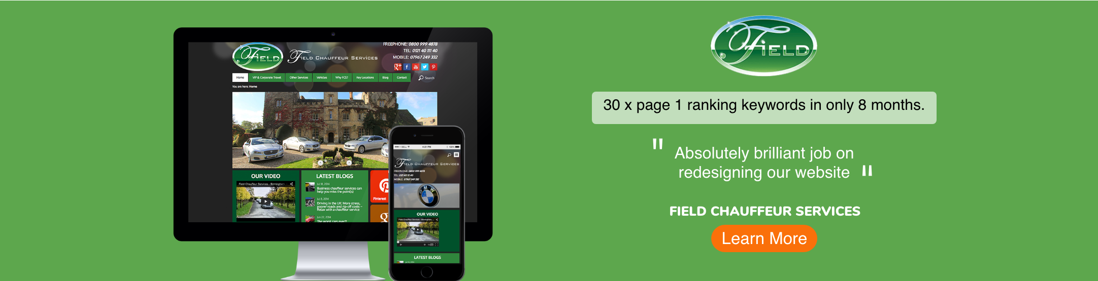 We achieved excellent page 1 rankings almost as soon as the website went live. During our time working with Field Chauffeur Services, we have seen a significant rise in organic visibility and continued improvement in rankings, including page 1 results for keywords like “Executive Chauffeur Services”, “Chauffeur Driven Service”and“Chauffeur Birmingham”.